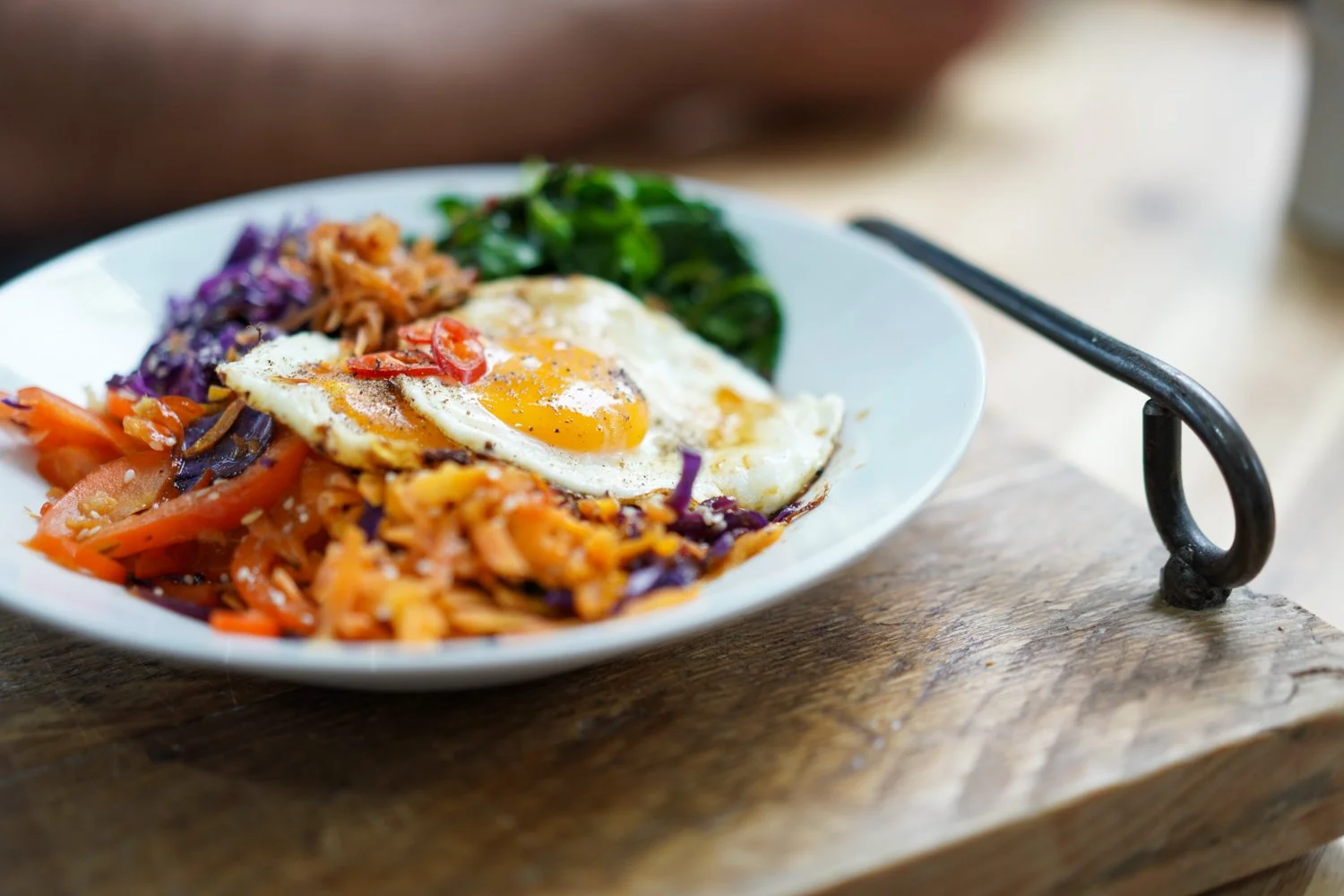 This light meal offers a rich blend of vitamins, minerals, and antioxidants from a variety of vegetables, combined with the protein and healthy fats from eggs and olive oil. The addition of ginger, kimchi and gochujang not only enhances flavour but also offers benefits to your gut microbiome and digestive health thanks to their fermented properties.